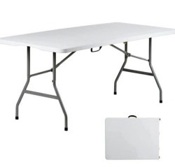 A clean, sturdy 6-foot folding table with a smooth white surface and a convenient carrying handle—perfect for events, parties, or workspace needs. The table folds flat for easy transport and storage, features a durable tabletop that wipes clean, and has metal legs with slip-resistant caps for stable setup on most surfaces. Sized to seat three people per side or to hold food, supplies, or display items, this versatile rental brings practical, neutral style to any occasion.